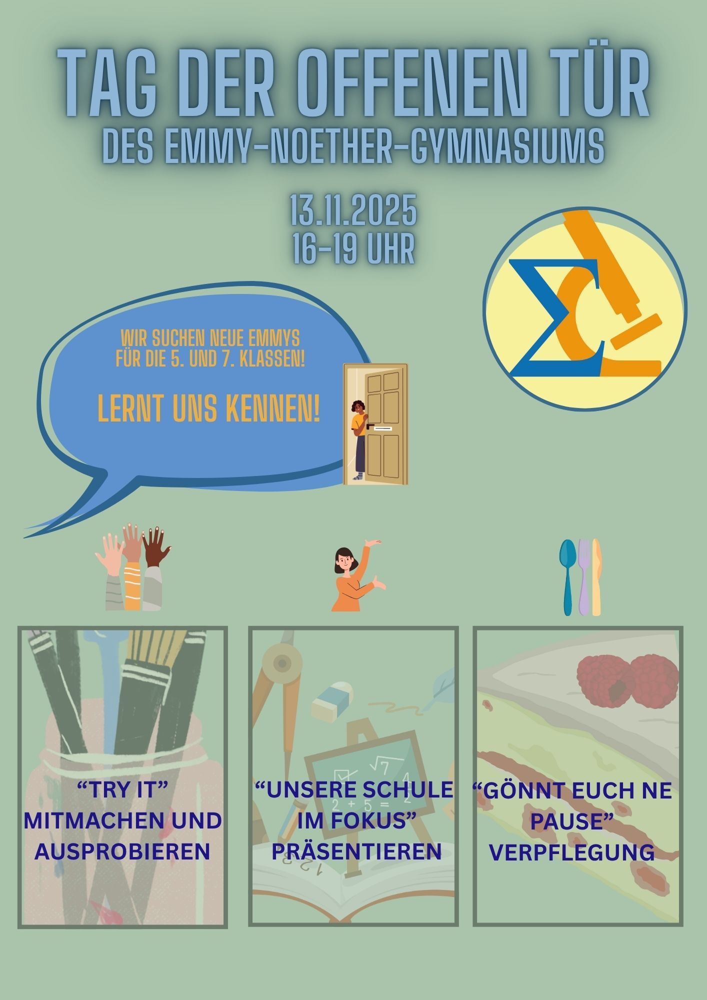 Am 13. November öffnen wir unsere Türen für alle interessierten Schüler und Schülerinnen, Eltern und Freunde der Schule! Der diesjährige Tag der offenen Tür bietet nicht nur einen spannenden Einblick in unseren Schulalltag, sondern greift auch Elemente unseres „Naturwissenschaftlichen Tages“ (Nawi-Tag) auf. Dazu lädt insbesondere der Fachbereich Naturwissenschaften interessierte Grundschülerinnen und Grundschüler zu einem naturwissenschaftlichen Schnuppernachmittag und -abend in das Emmy-Noether-Gymnasium ein.